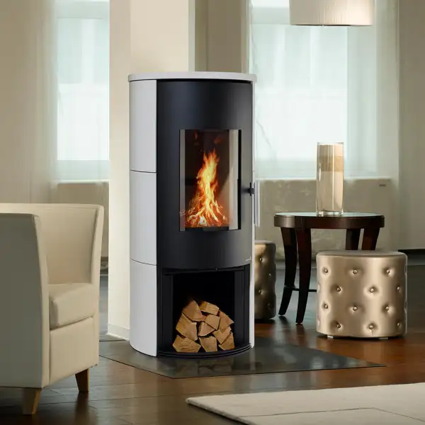 Élégant, haut et de section presque circulaire, le Vitus apporte une touche de style à chaque pièce où il est installé. La porte noire du foyer, avec sa vitre haute de 430 x 280 mm, suit également sa forme extérieure incurvée. L’observateur peut ainsi voir le feu à l’intérieur sous différents angles. Il en résulte une impression unique qui garantit des moments inoubliables et une expérience de la cheminée tout à fait particulière.